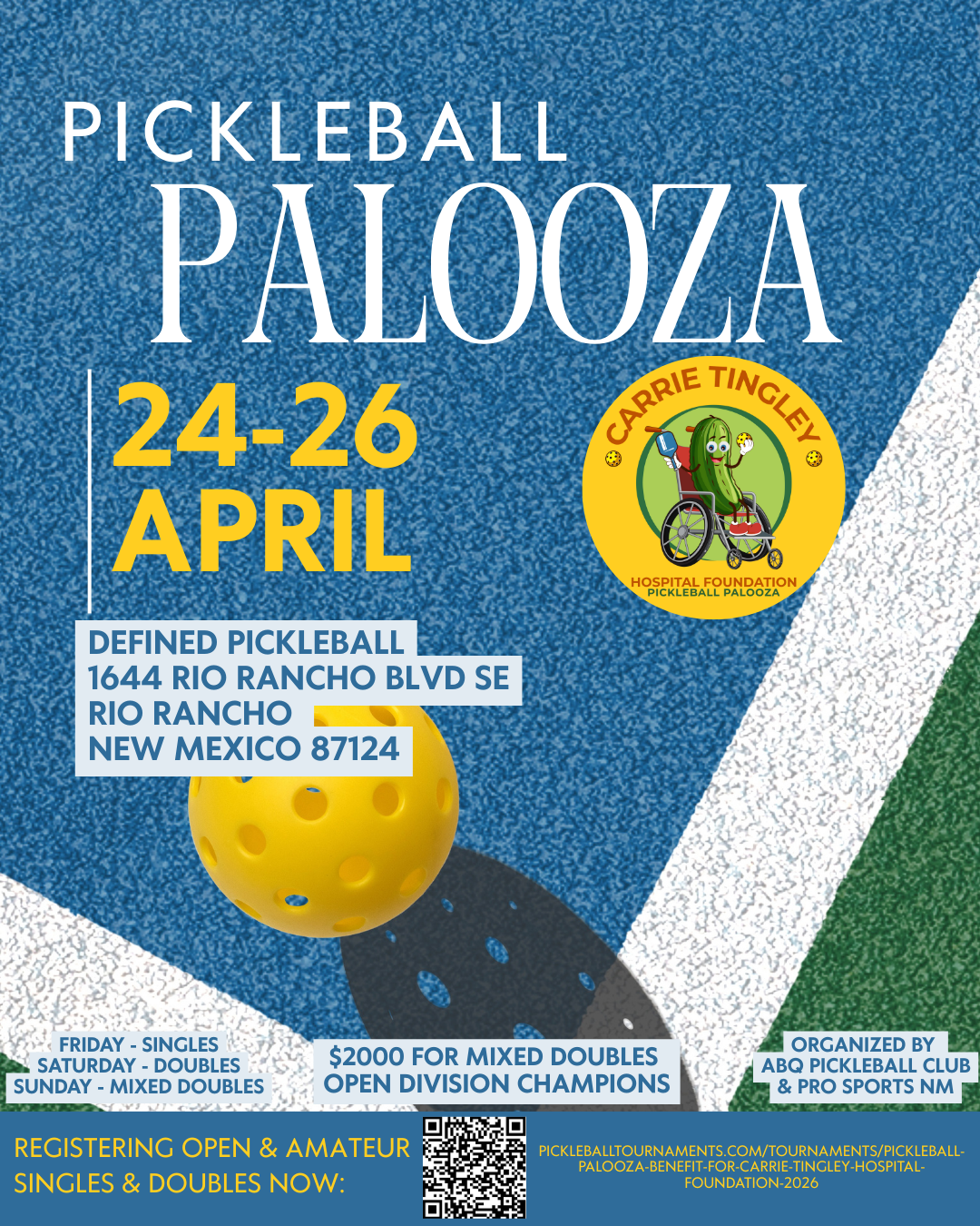 Pickleball Palooza will be hosted at Defined Pickleball in Rio Rancho from April 24-26, 2026. The entry fee is $75. All players aged 19 and above of all skill levels are welcome. There will be men's singles, women's singles, doubles, and mixed doubles competitions in amateur and open brackets. The champions of the mixed doubles open bracket will receive prize money!