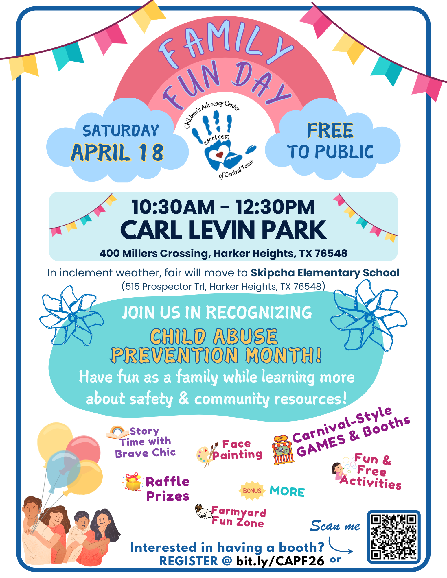 The Child Abuse Prevention Fair is a FREE, family-focused event bringing together local organizations, interactive activities, and valuable prevention resources — all centered around one goal: protecting children and strengthening families in our community. Come learn, connect, and have some free family fun! 💙