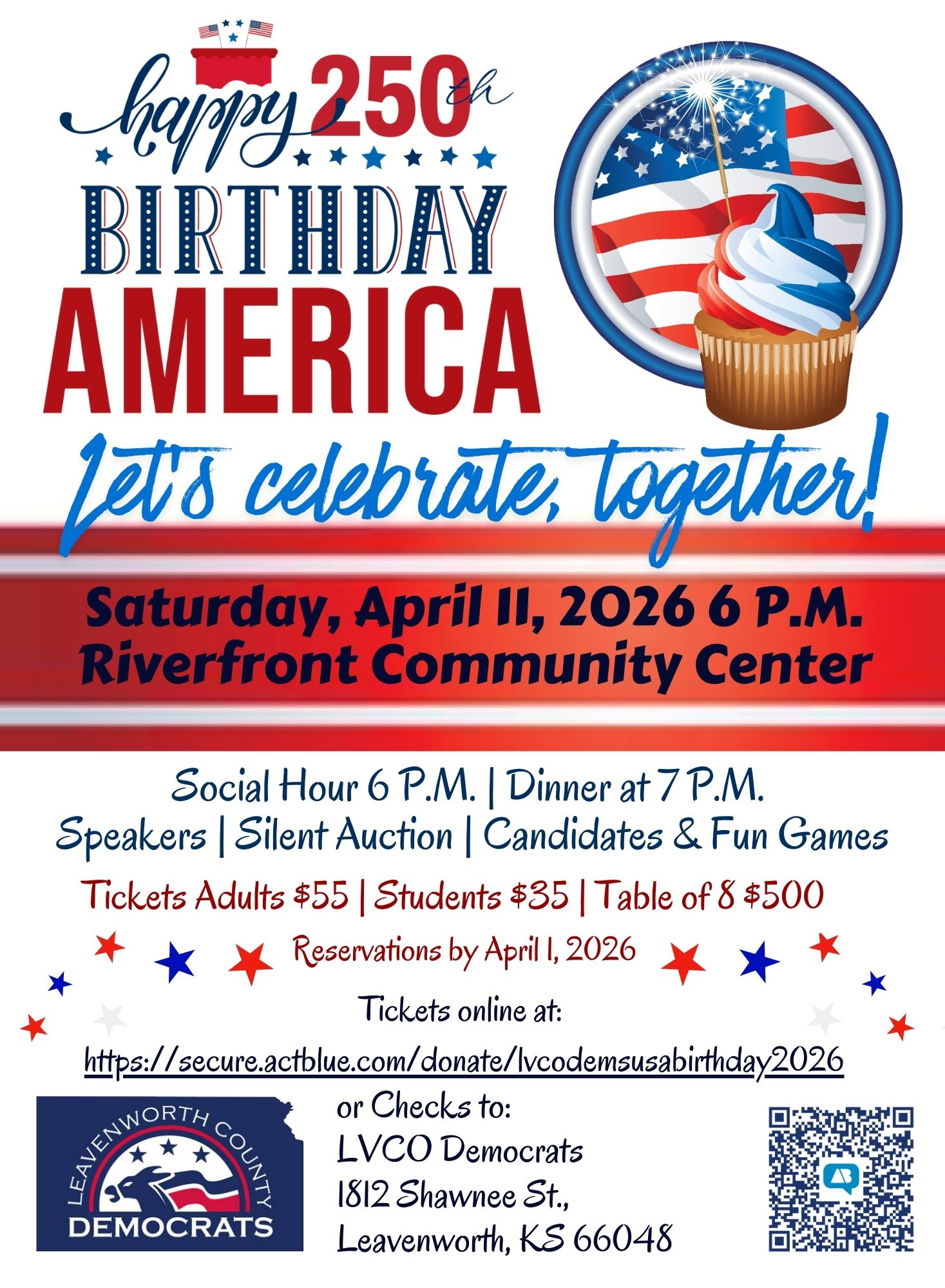 Happy 250th Birthday America! Come celebrate with the Leavenworth County Democrats as we celebrate our nation's birth at the Riverfront Community Center on Saturday, April 11 at 6:00 PM with a social hour, dinner, guest speakers, silent auction, and party games for everyone!