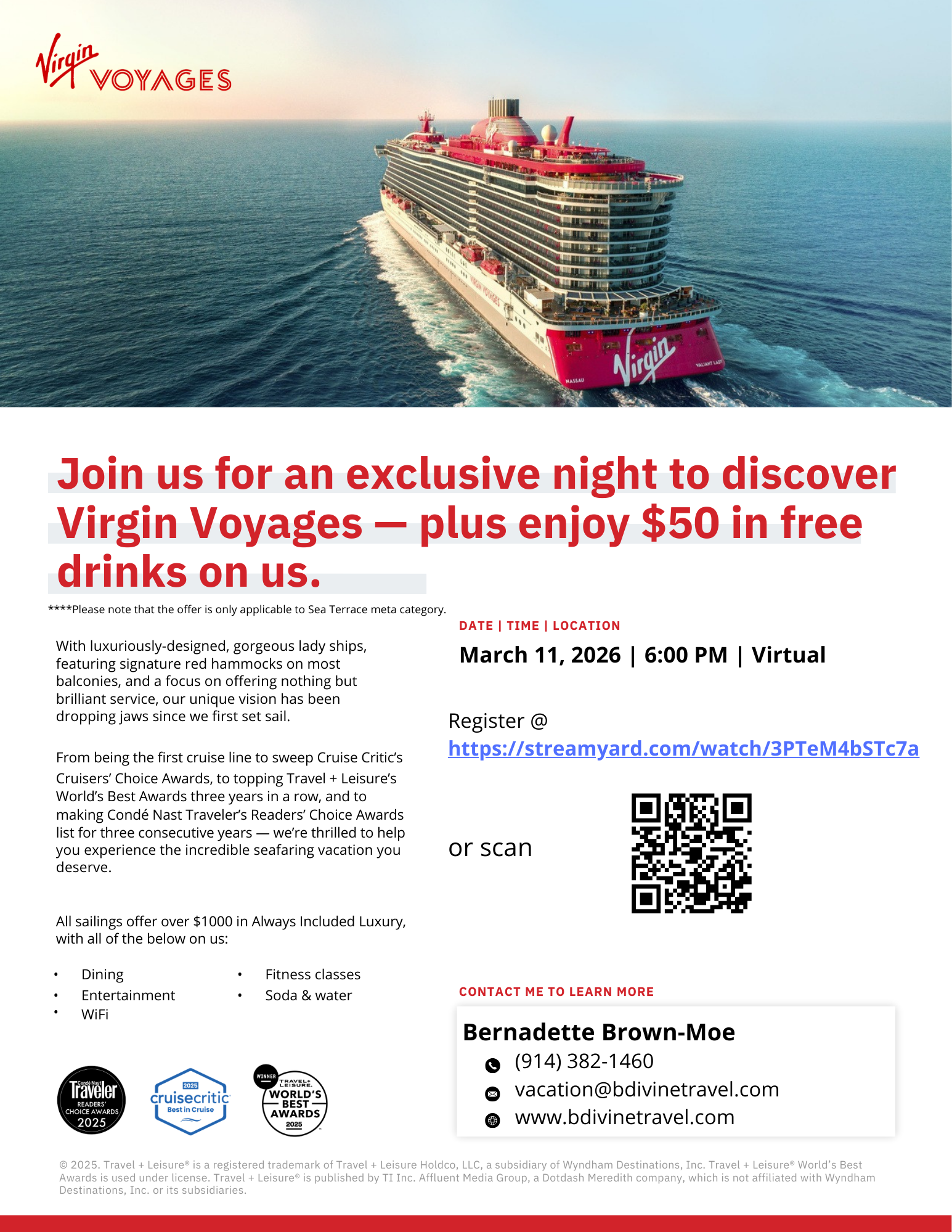 Join BDivine Travel for a fun and interactive virtual event where we’ll dive into everything you need to know about sailing with Virgin Voyages — the award-winning, adults-only cruise experience redefining what it means to vacation at sea. March 11th, 2026, 6 PM