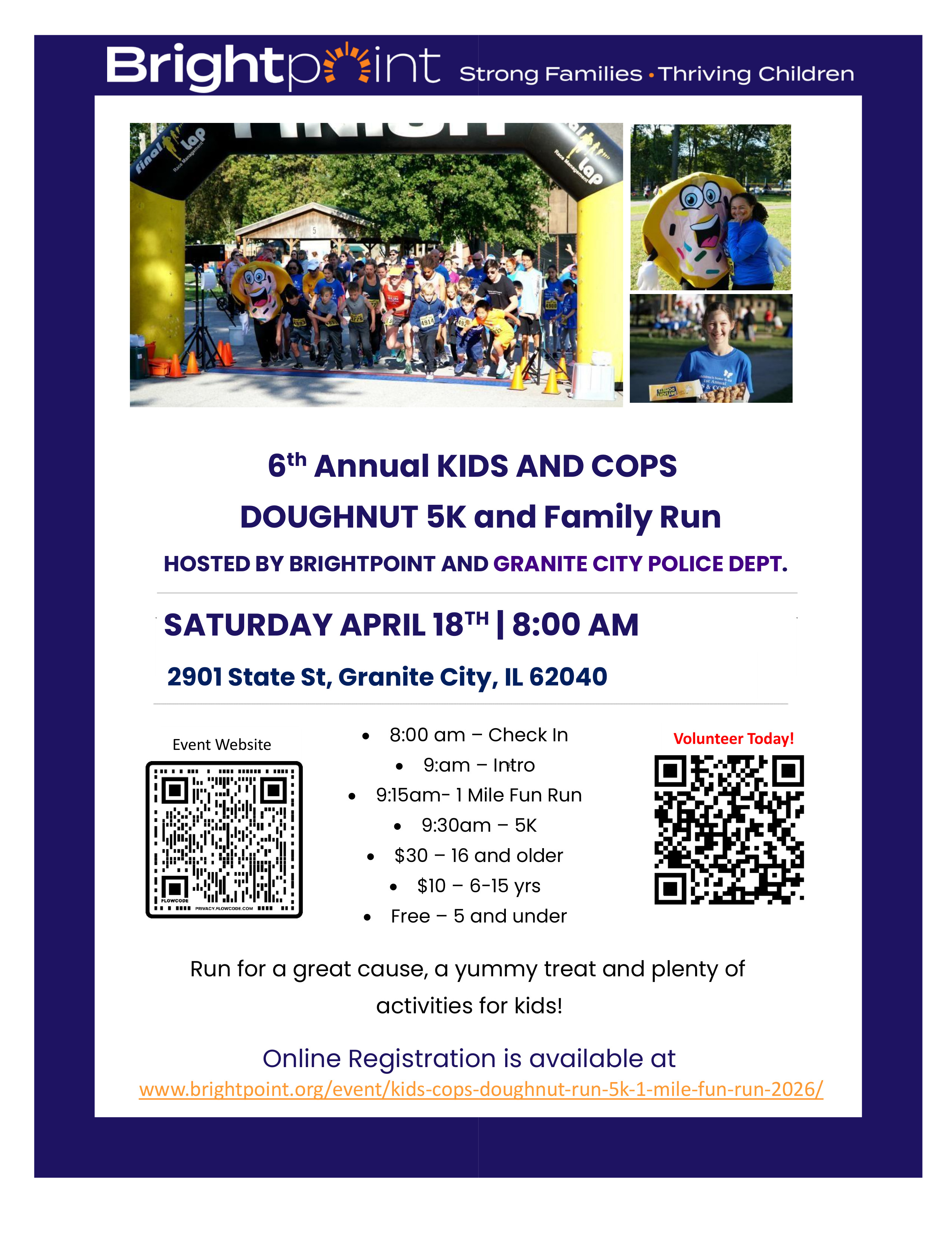 In honor of Child Abuse Prevention Month, Brightpoint and the Granite City Police Department invites you to participate in our race to end child abuse. Proceeds from this event will benefit the programs and services offered by the Southern Region of Brightpoint.