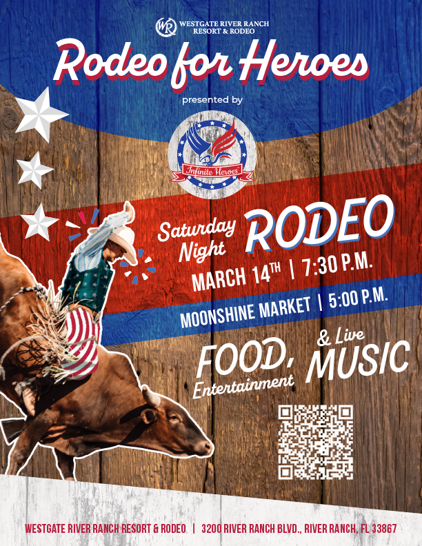 Westgate River Ranch Resort & Rodeo: The Rodeo for Heroes, proudly sponsored by the Infinite Hero Foundation. Saturday, March 14th at 7:30 PM. 3200 River Ranch Blvd., River Ranch, FL. This powerful evening is dedicated to honoring our nation’s veterans through the excitement of the rodeo, the spirit of community, and the joy of celebration. Click HERE for the flyer and scan the QR Code for more info.
