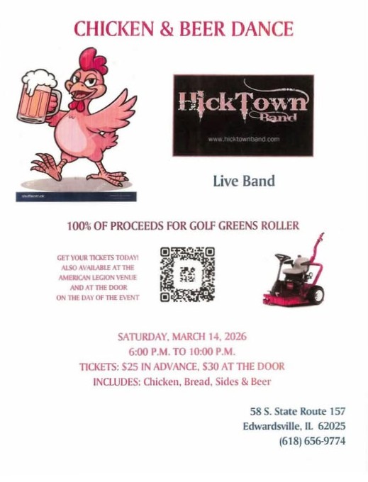 The Edwardsville American Legion Post #199 is hosting a chicken and beer dance to raise much needed funds for a golf greens roller to service their 9-hole golf course. Event will feature a meal and live music from the HickTown Band. Tickets are $25 in advance or $30 at the door.