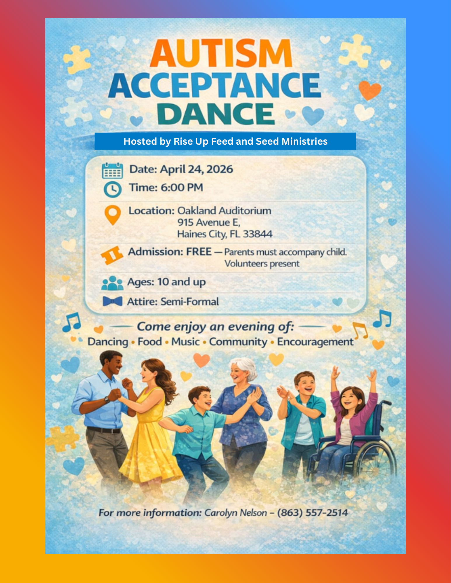 Autism Acceptance Dance - Friday, April 24th, 6 p.m. at the Oakland Auditorium, 915 Ave. E, Haines City, FL - hosted by Rise Up Feed and Seed Ministries - Admission FREE - Parents must accompany child - Volunteers will be present - Ages 10 and up. See the flyer for more info - Click HERE.