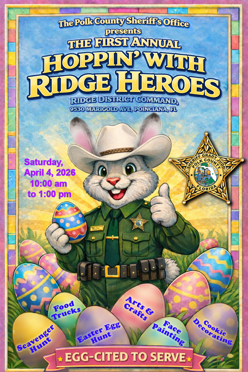 It's the Polk County Sheriff's Office Ridge District Command's first-ever Easter-themed "Hoppin' With Ridge Heroes" event, located at the PCSO's newest patrol district in Poinciana! Hop on over from 10 AM to 1 PM on Saturday, April 4th, for an Easter egg hunt, scavenger hunt, arts & crafts, face painting, cookie decorating, and food trucks! Polk County Animal Control will also be there with cats and dogs ready for adoption! Find your fur-ever friend. We'll see you at the Ridge District, 9530 Marigold Avenue, Poinciana. Click HERE for the flyer.