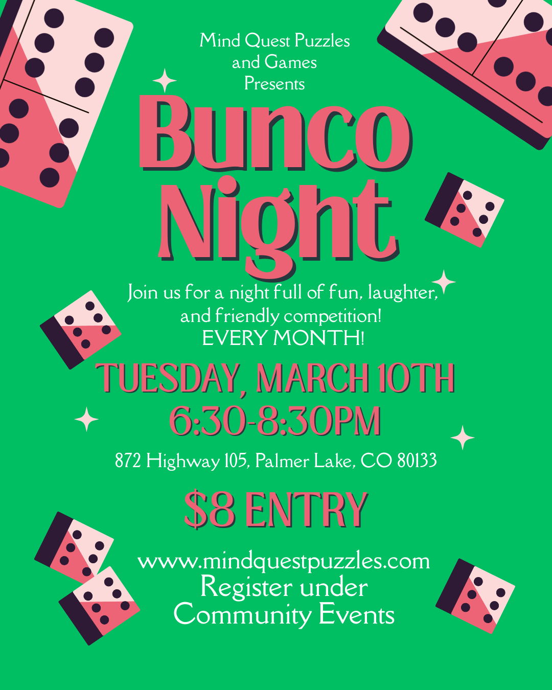 Join us for a fun-filled Bunco event where luck, laughter, and friendly competition come together! Bunco is an easy-to-learn dice game played in teams of four per table. (If a table isn’t full, a “ghost” player fills in.)