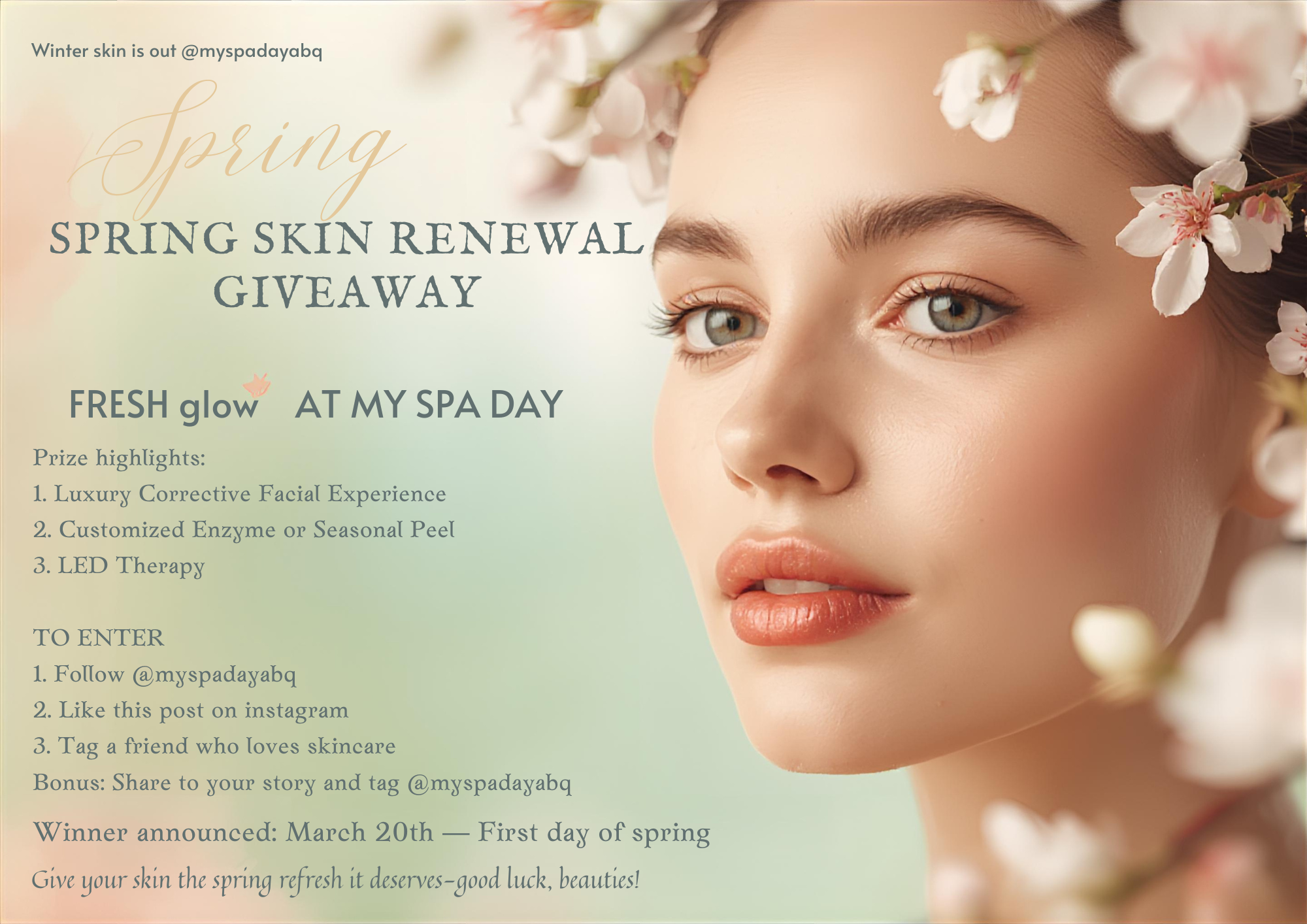 SPRING SKIN RENEWAL GIVEAWAY ✨ Winter skin is out. Fresh glow is in. I’m gifting one Luxury Corrective Facial Experience at My Spa Day to celebrate the start of spring and welcome new beautiful faces into the treatment room. The winner will receive: • Luxury Corrective Facial • Customized enzyme or seasonal peel • LED therapy for that next-level glow This is the perfect reset for dull, congested, or post-winter skin.