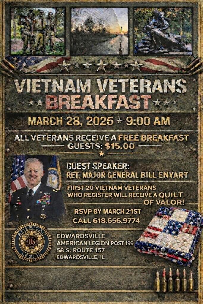 The American Legion Post 199 in Edwardsville is hosting a Vietnam Veterans Breakfast featuring guest speaker Ret. Major General Bill Enyart. All veterans will receive a free breakfast and guest are welcome to attend for $15. The first 20 Vietnam Veterans registered will receive a Quilt of Valor. Please RSVP by March 21 by calling 618-656-9774.