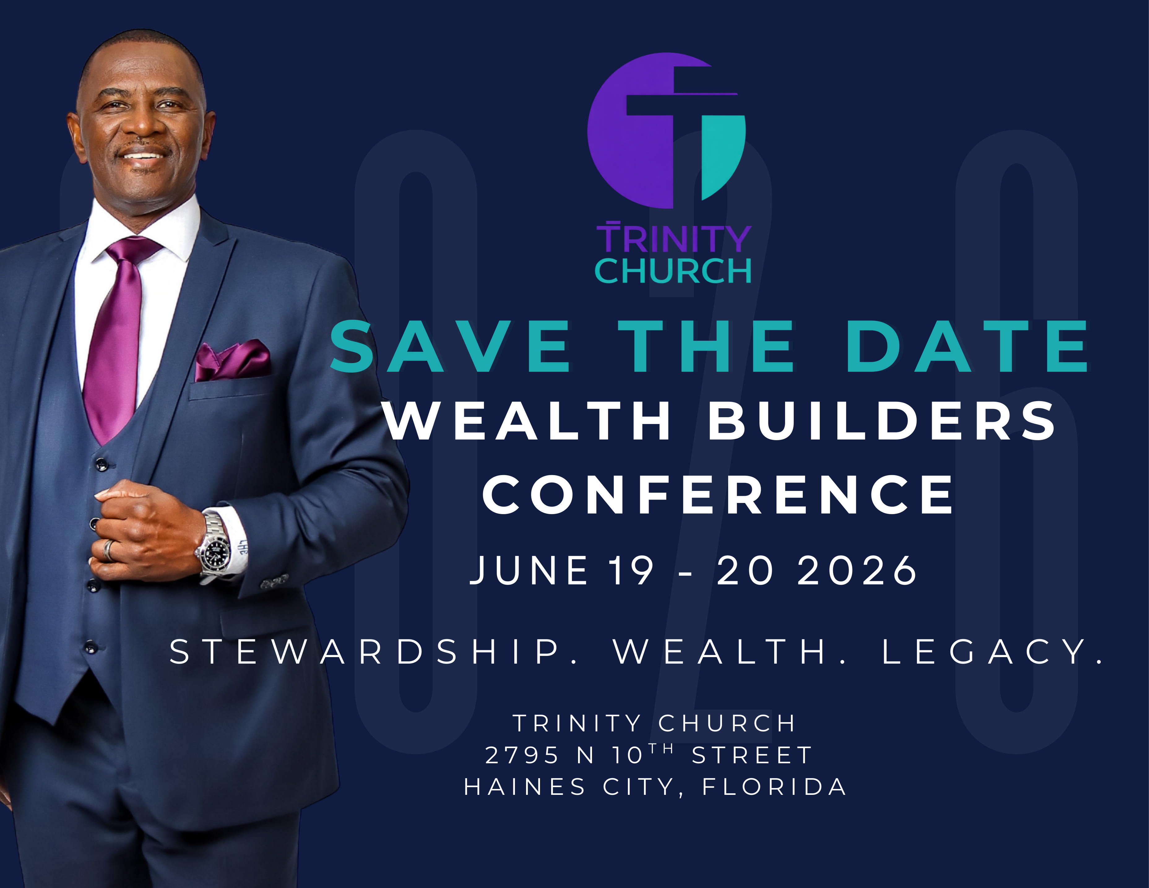 Save the Date - Trinity Church Wealth Builders Conference - June 19th - 20th, 2026 - 2795 N 10th Street, Haines City, FL - Stewardship - Wealth - Legacy. More info coming soon. Click