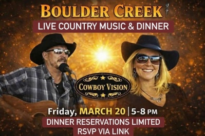 There will be a fantastic, curated menu by Chef Mauricio Mejia and special musical guests, Cowboy Vision, will perform throughout the evening. The show, suitable for families, will feature Nashville recording artist Stan G Murphy and his duo partner, Angela Richman. This unique event at Boulder Creek begins at 5:00PM with reservations required throughout the evening. As a reminder, use the link HERE to choose your party’s preferred time.