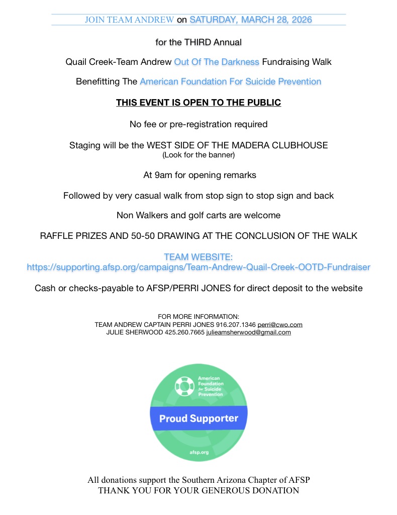 Join us to help raise awareness for Suicide Prevention at the Out of The Darkness fundraising walk starting at the Madera Clubhouse in Quail Creek on March 28 - watch for the event banners. This event is open to the entire community.