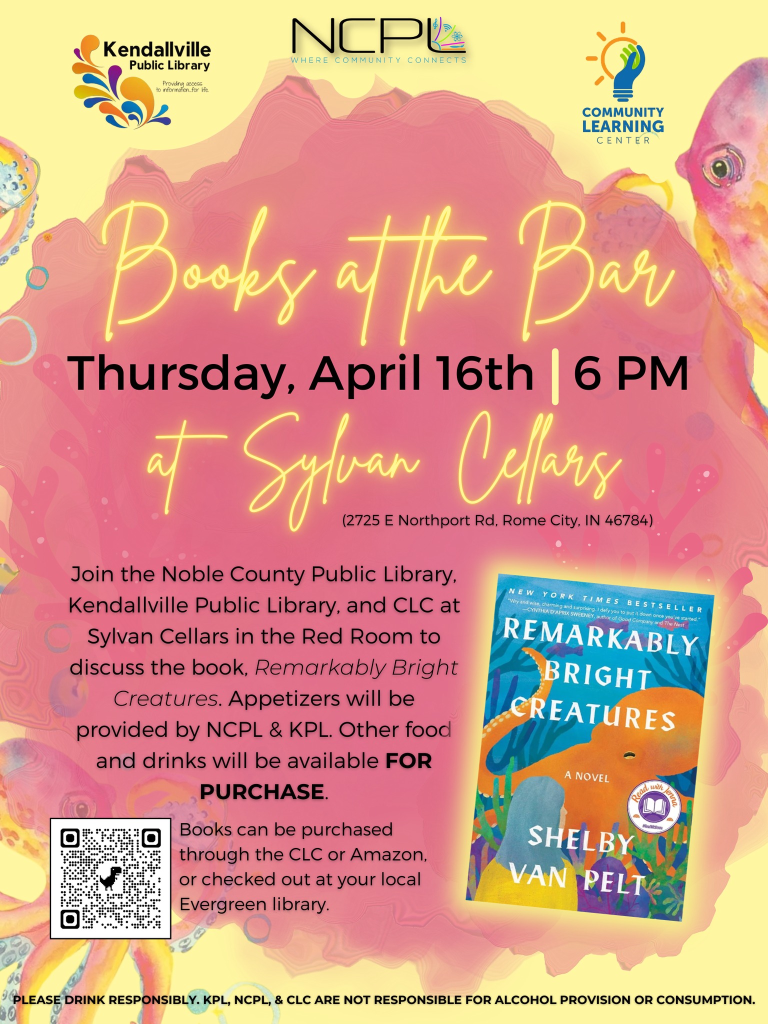 Hey book lovers! Head to Sylvan Cellars Red room on April 16th to join the NCPL and CLC to discuss the book Remarkably Bright Creatures! Appetizers will be provided. Other food and drinks will be available for purchase. Can't wait to see you all there!