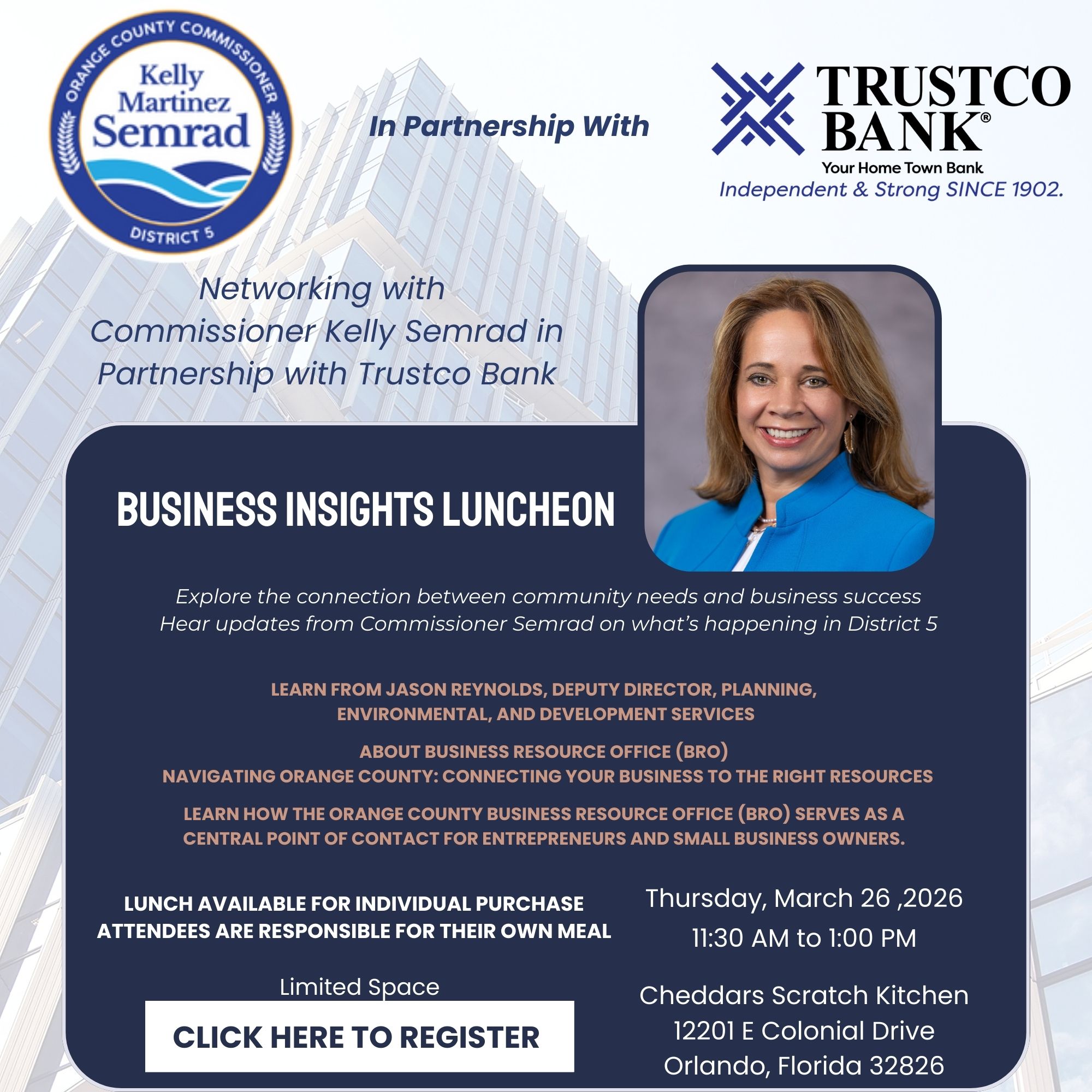 This event will feature an engaging session with the Commissioner Semrad, where you 'll learn how the Orange County Office can support your local business. We'll also hear from Jayson Reynolds, Deputy Director of PEDS, who will share valuable insights and resources available to you.