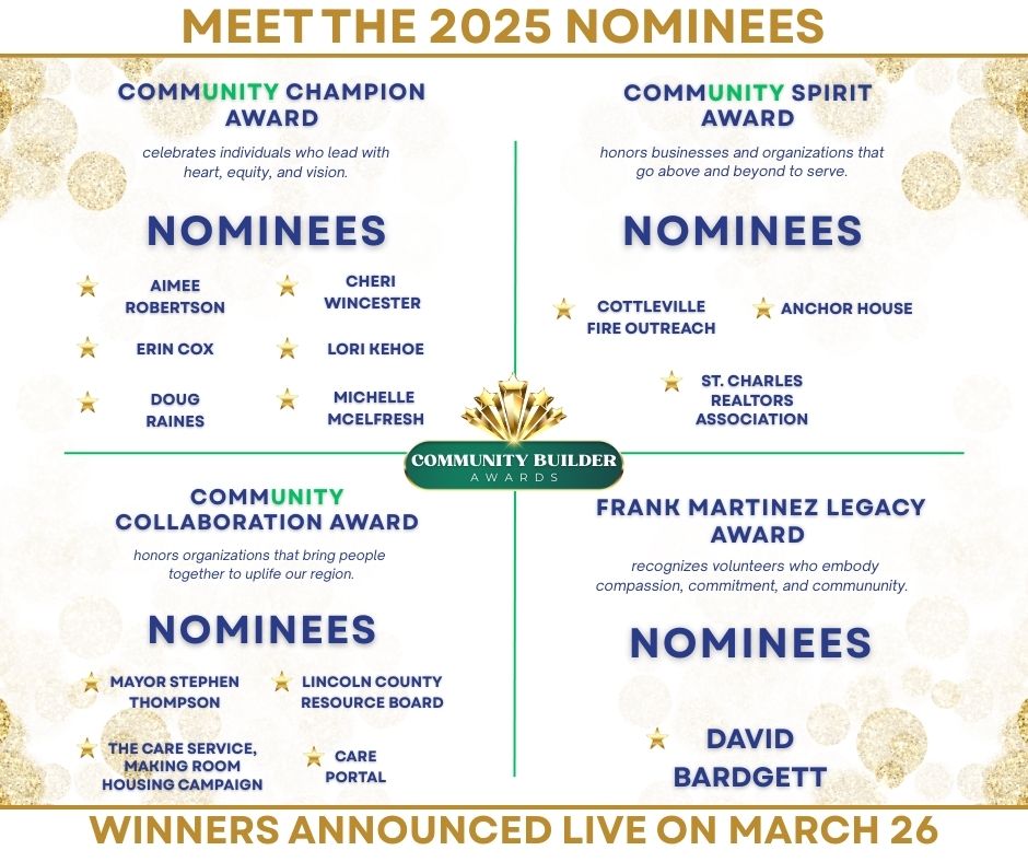 We’re excited to celebrate the 2025 Community Builder Awards on March 26, 2026, at PFEM Hall & Banquet Center in St. Peters, Missouri. This annual event honors local changemakers whose service, leadership, and dedication strengthen our region and inspire others to do the same.