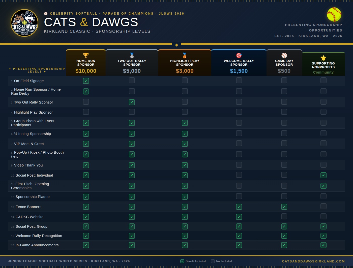 The Cats & Dawgs Kirkland Classic is the official celebrity softball game and opening ceremonies for the Junior League Softball World Series (JLSWS) — Kirkland's biggest week in youth sports. Celebrating the 25th Anniversary of the JLSWS in Kirkland, the Classic kicks off a full week of international competition that runs August 2–8, 2026 at Everest Park, with games broadcast live on ESPN+.