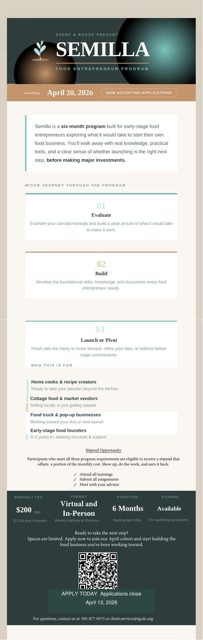 Presented by SVEDC & RGCDC, Semilla is a six-month program for early-stage food entrepreneurs exploring what it takes to start their own food business. Walk away with real knowledge, practical tools, and clarity before making major investments.