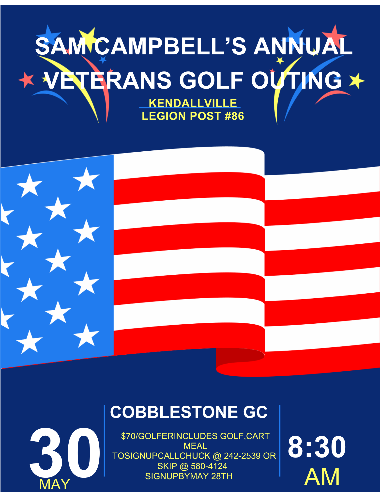 Please join the Kendallville Legion Post #86 as they host the Sam Campbell Veteran's Golf Outing on May 30th, 2026, at Cobblestone Golf Course!