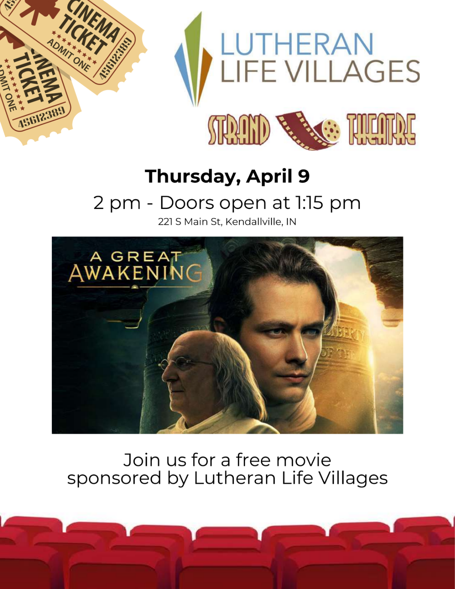 Lutheran Life Villages invites you to the Strand Theatre on Thursday, April 9th for a FREE showing of A Great Awakening. This film follows the friendship between George Whitefield and Benjamin Franklin, and Whitefield's impact during the pivotal Great Awakening religious movement.