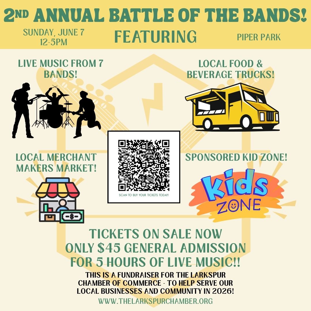 ON SALE NOW!! Grab your tickets today for the 2nd Annual Larkspur Chamber of Commerce Battle of the Bands! π₯π€