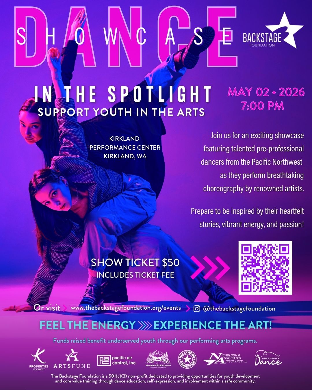 Join us at Kirkland Performance Center, on May 2nd at 7pm, for an exciting showcase featuring talented pre-professional dancers from the Pacific Northwest as they perform breathtaking choreography by renowned artists. Prepare to be inspired by their vibrant energy and passion!