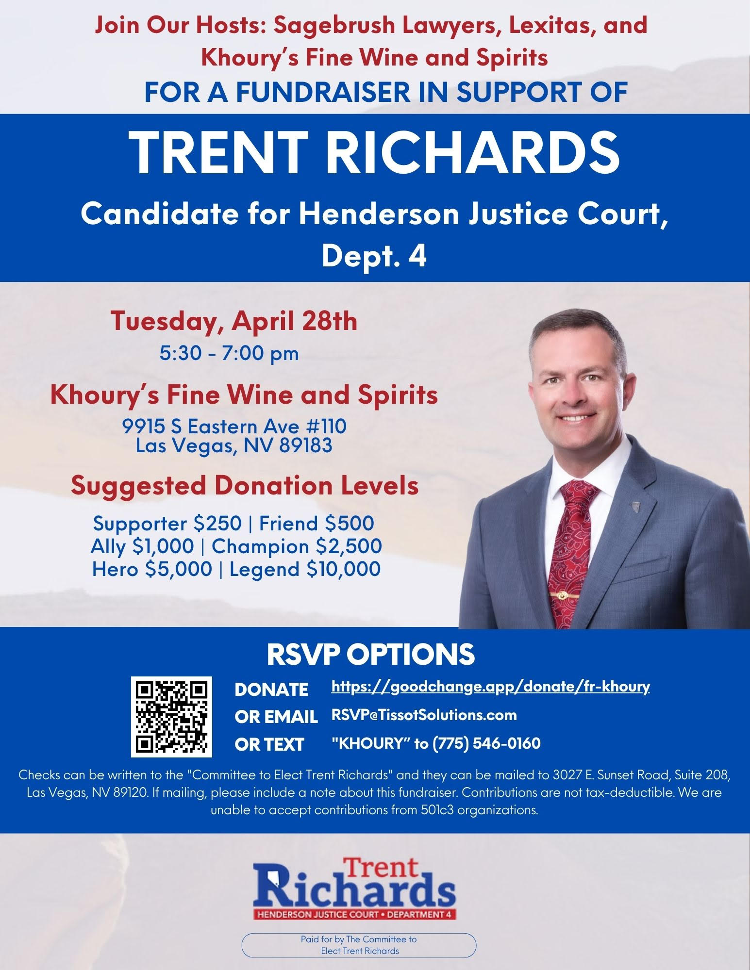 Join hosts Sagebrush Lawyers, Lexitax, and Khoury's Fine Wine & Spirits on Tuesday, April 28, 2026 from 5:30pm to 7:00pm at Khoury's Fine Wine & Spirits on 9915 S Eastern Ave., #110, Las Vegas, NV 89183 as they support Trent Richards for Henderson Justice Court, Department 4.