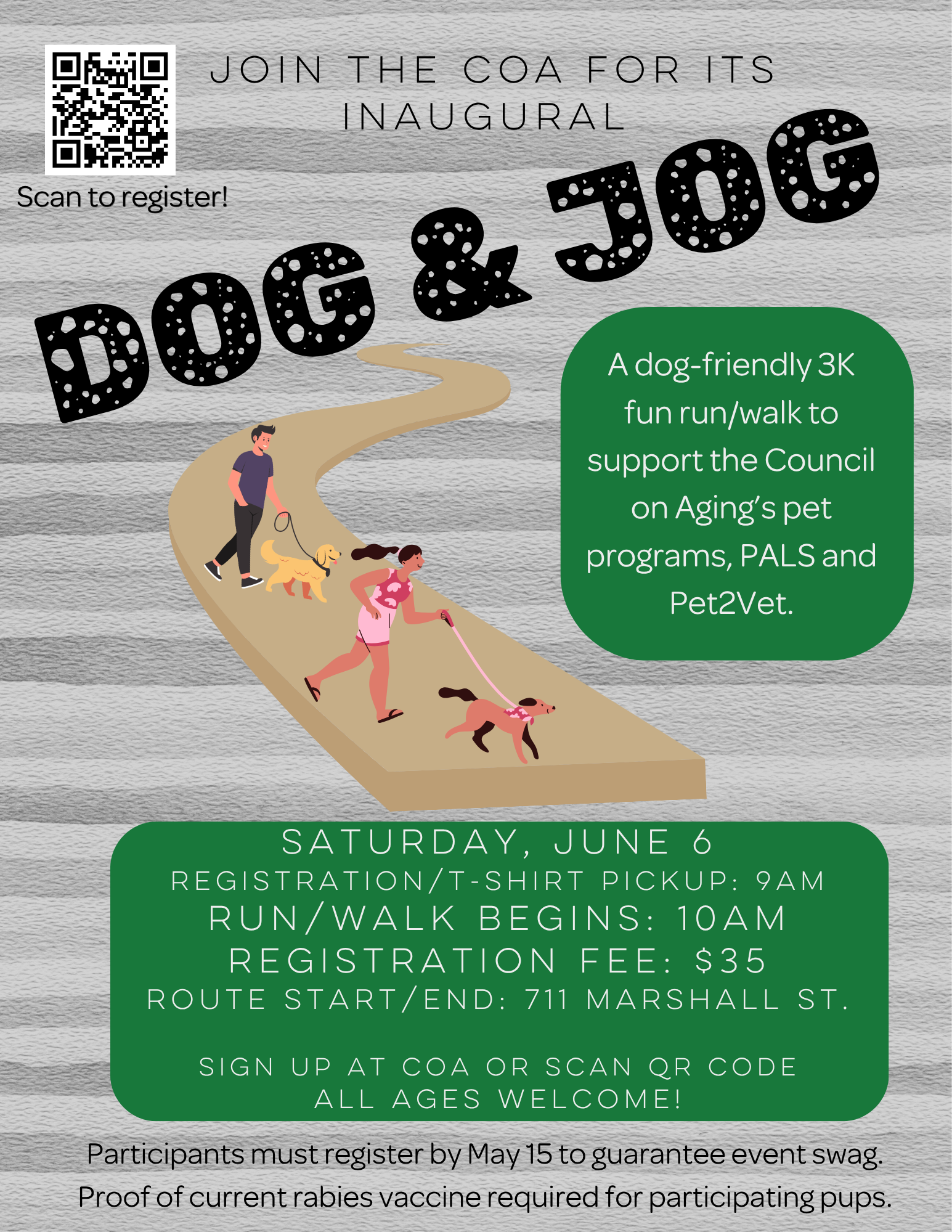Registration fee of $35 per participant, for all participants over the age of 12. Proof of rabies vaccination required for attending dogs. This event is open to all ages, in support of the COA's pet programs.