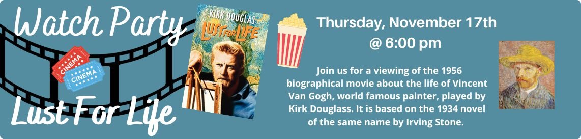 Join us for a viewing of the 1956 biographical movie about the life of Vincent Van Gogh, world famous painter, played by Kirk Douglass. It is based on the 1934 novel of the same name by Irving Stone.