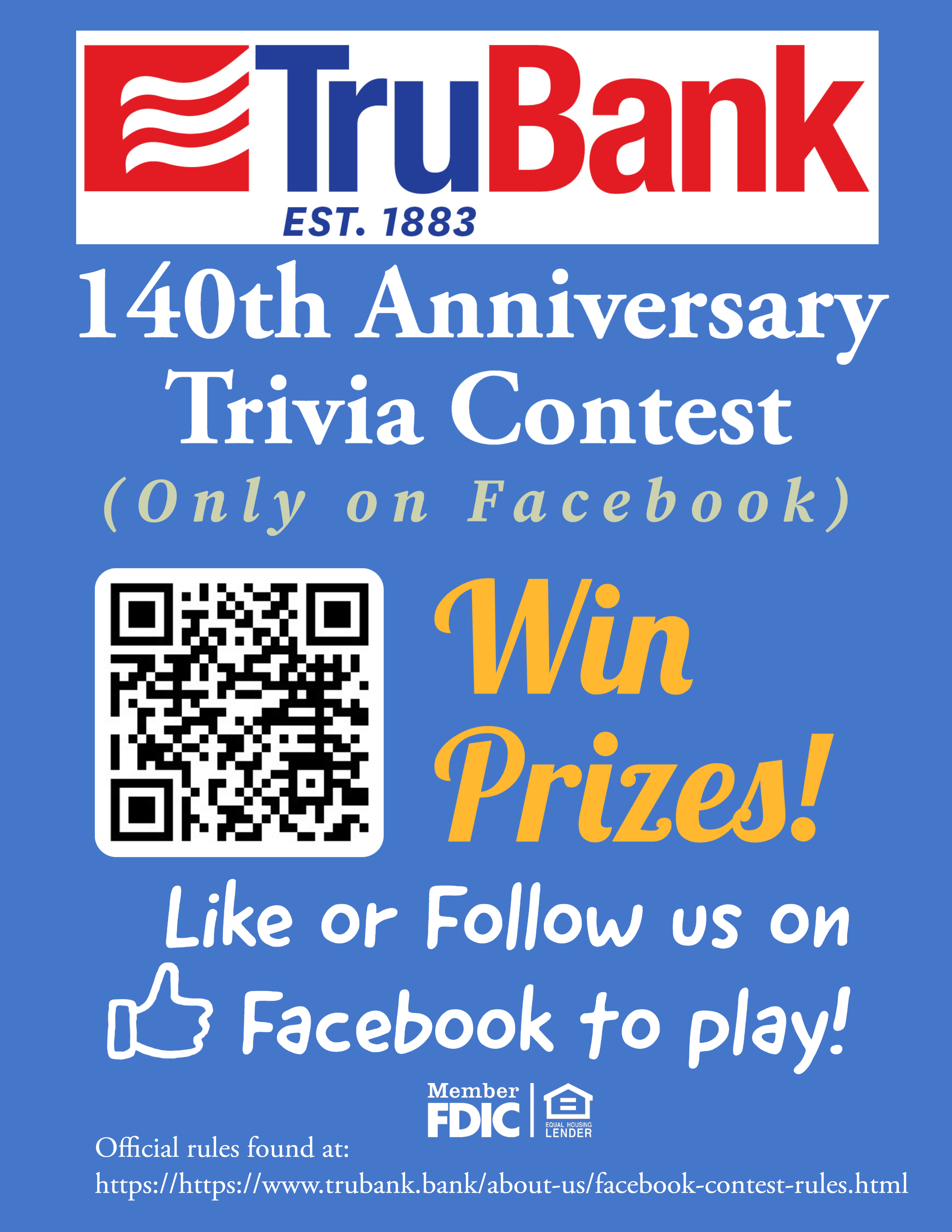 Like and follow TruBank on Facebook for your chance to win the TruBank 140th Anniversary Facebook Trivia Contest!