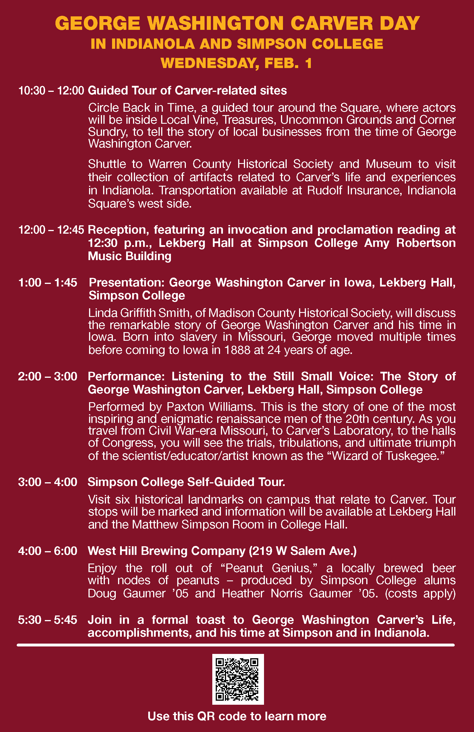 Last June, Governor Kim Reynolds declared February 1st as George Washington Carver Day. This day is meant to remember the Scientific and Humanitarian Achievements of George Washington Carver, Simpson Alum, and Indianola Resident.