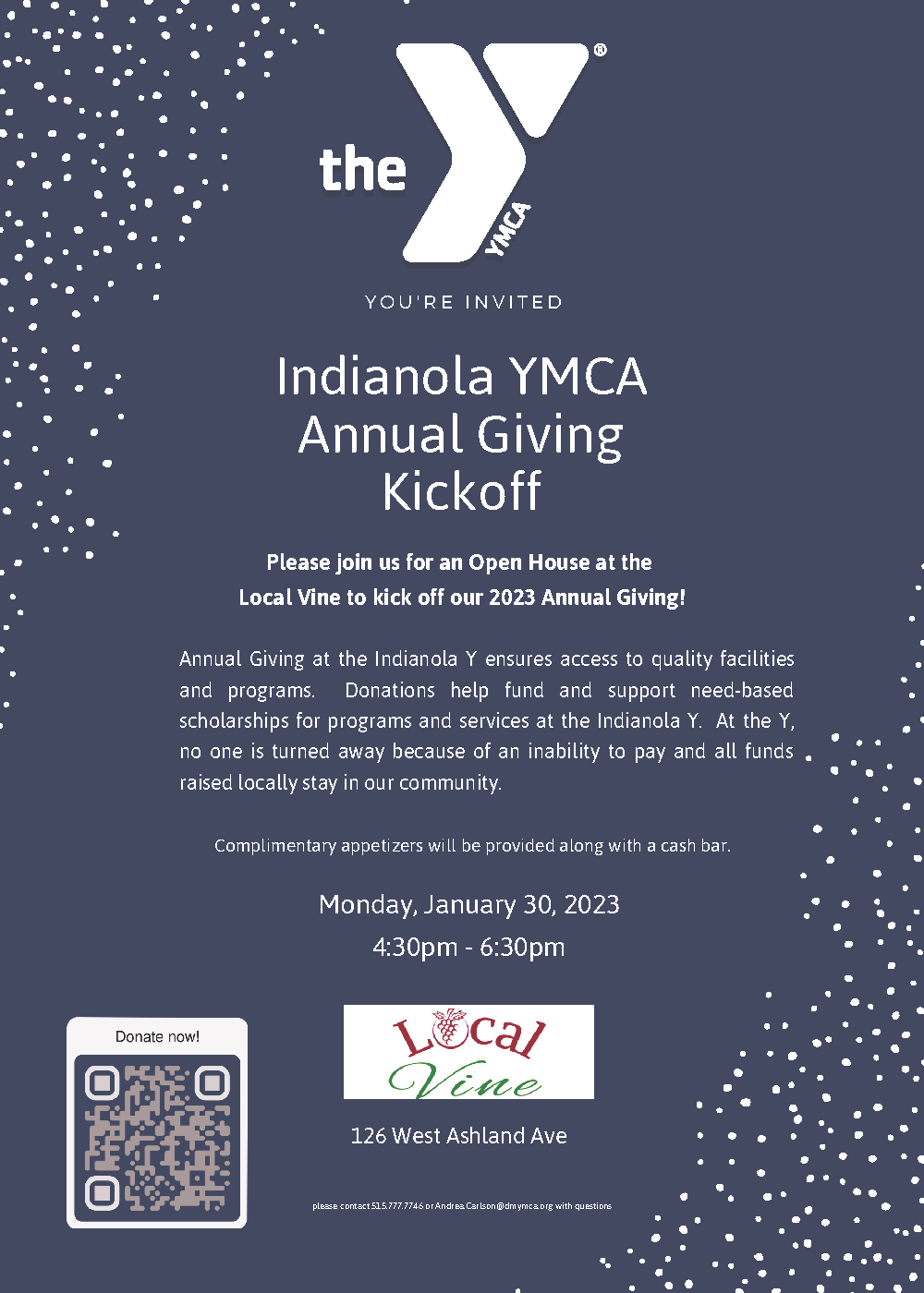 Mark your calendars! The Indianola YMCA is hosting their Annual Giving Kickoff and Open House on January 30th from 4:30 - 6:30 p.m. at the Local Vine, 126 W Ashland Avenue! Did you know that when you donate to the Indianola YMCA, that money stays in the Indianola community? The money raised each year helps provide financial assistance and scholarships for memberships and youth programming.