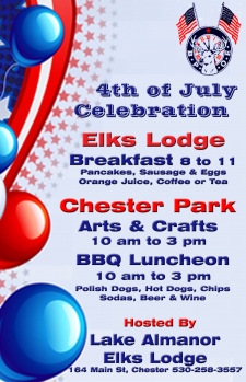 Enjoy the Elks Pancake Breakfast at the lodge on Main Street from 8:00 to 11:00am. Guests will be served two pancakes, scrambled eggs, two sausages, juice and coffee for $14.00. Bloody Mary's will be poured, on site only, for $8.00. After parade, Elks hosts the annual Crafts Fair and Barbecue at Chester Park. Hot dog or polish dog, chips and soda for $10:00. Beer Wagon by the barbecue with draft beer or glass of wine for $5.00. Tax included on all meals.