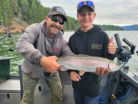 Captain Rob Ayers  10 year old Jaxon Sullivan holding a beautiful Lake Almanor rainbow trout. This was Jaxon's first trip to the Lake. He enjoyed Father's Day with his dad at Plumas Pines.