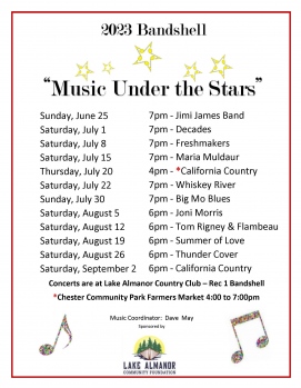 Sunday night June 25th is the first concert in the 2023 Bandshell series “Music Under the Stars” hosted by the Lake Almanor Community Foundation. The Jimi James Band is the featured group with the concert beginning at 7:00pm at REC 1 inside the gate of LACC. This week thank you to Lake Almanor Ace Hardware for adult raffle items. $20/36 tickets; $10/15; $6/5. The cost is $10 per car.