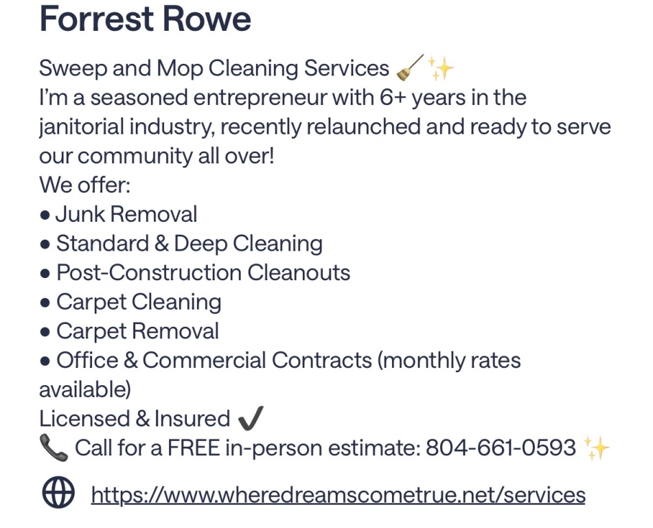 I’m a seasoned entrepreneur with 6+ years in the janitorial industry, recently relaunched and ready to serve our community all over and Charge extra for Further Travel!