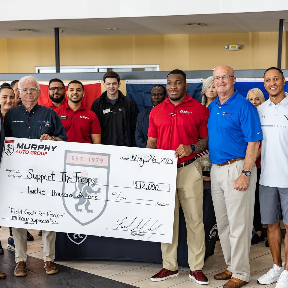 Friday, May 31, 2023, General Karl Horst, Chief of Staff for Murphy Family Enterprises, Murphy Auto Group and Miracle Toyota along with XFL Guardians Defensive Coordinator, Tony Carter, presented Support the Troops a check for $12,000.00 as part of their partnership and commitment to the XFL Guardians “Field Goals for Freedom” season-long promotion. Click HERE for the press release.