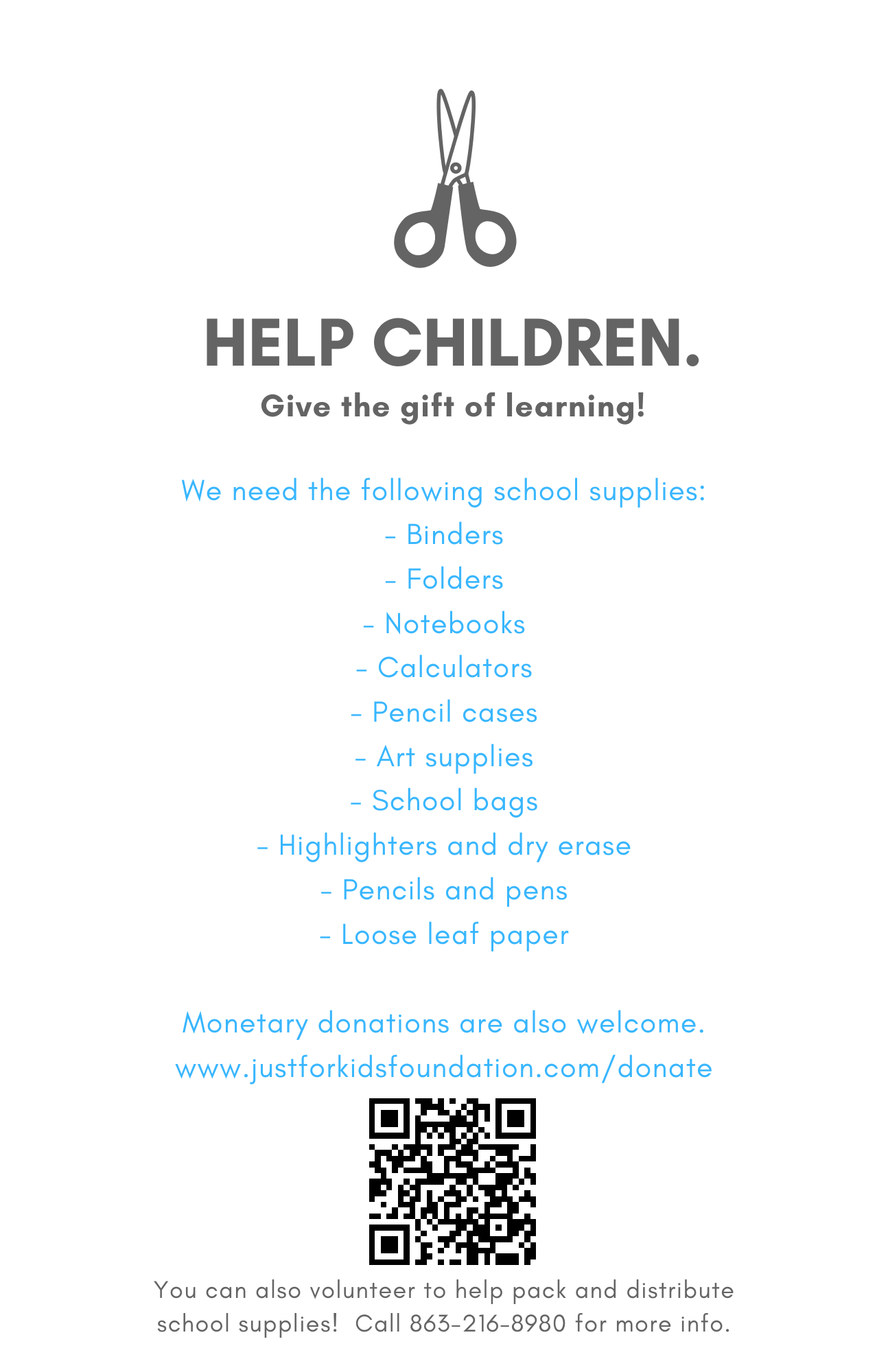See the list for needed supplies: Click HERE Items can be dropped off at the Chamber office: 35610 Hwy. 27, Haines City or at additional locations listed on the flyer. |