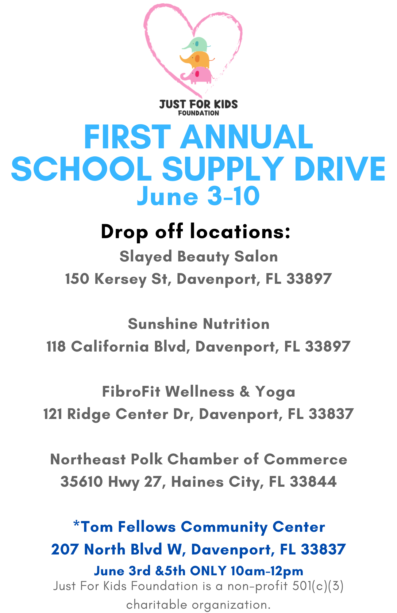 First Annual School Supply Drive of the Just For Kids Foundation - June 3rd - 10th - Binders, folders, notebooks, pens & pencils & more!