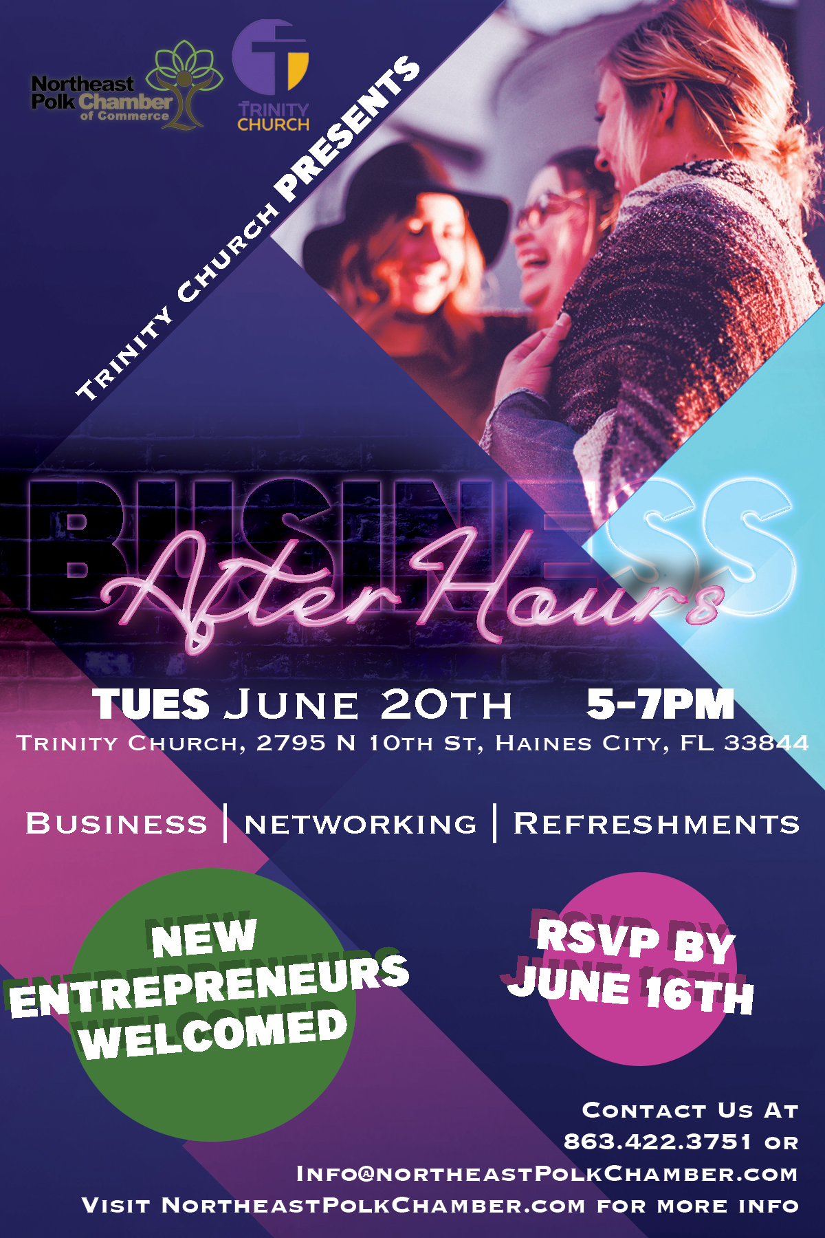 Date: Tuesday, June 20th Time: 5 -7 p.m. Location: Trinity Church, 2795 North 10th Street, Haines City FREE for Chamber Members! RSVP to the Chamber by Friday, June 16th - info@northeastpolkchamber.com or call 863-422-3751.