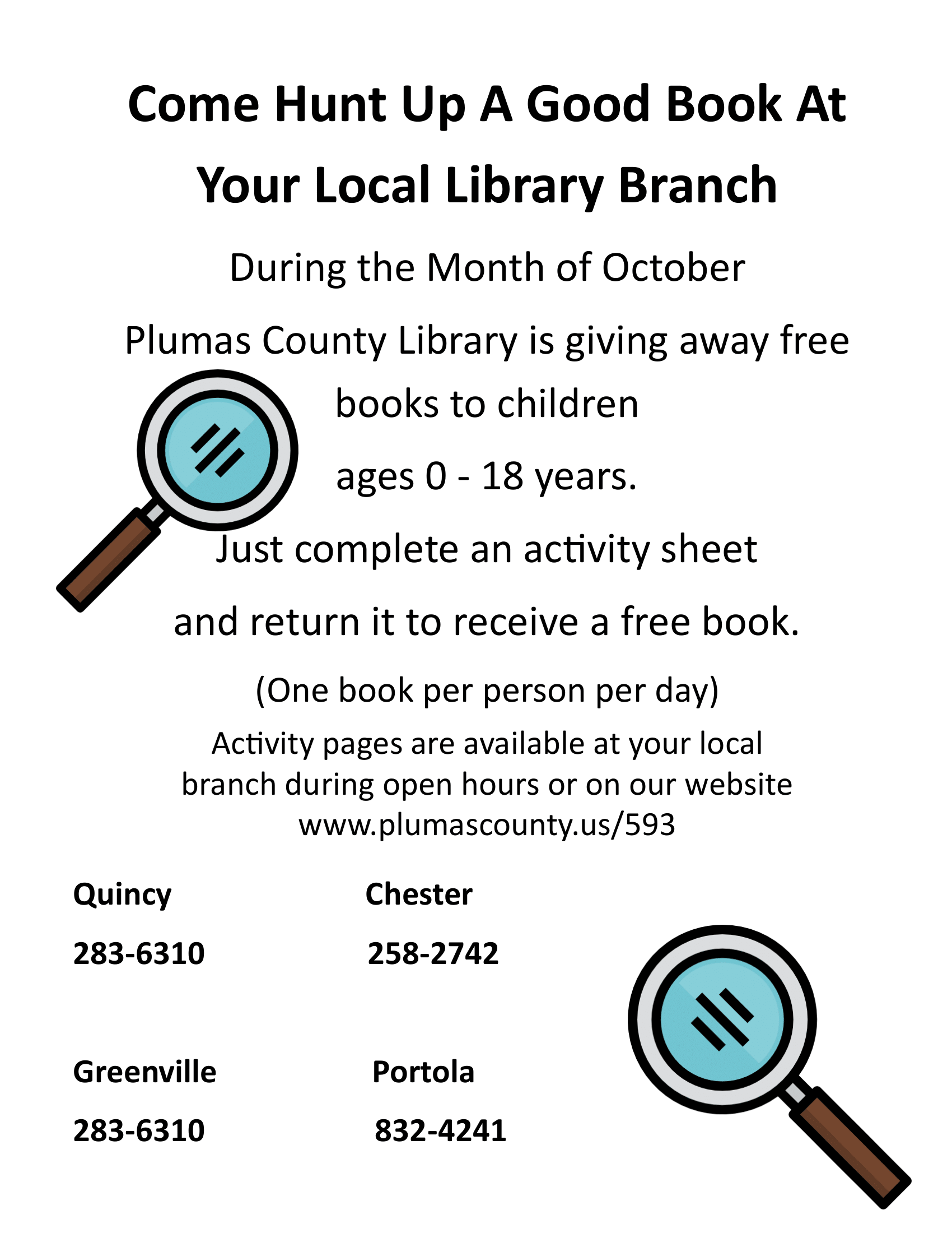- Plumas Rural Services is looking for two Respite Providers. Stop by their office at 711 E. Main Street in Quincy for more information and to apply.