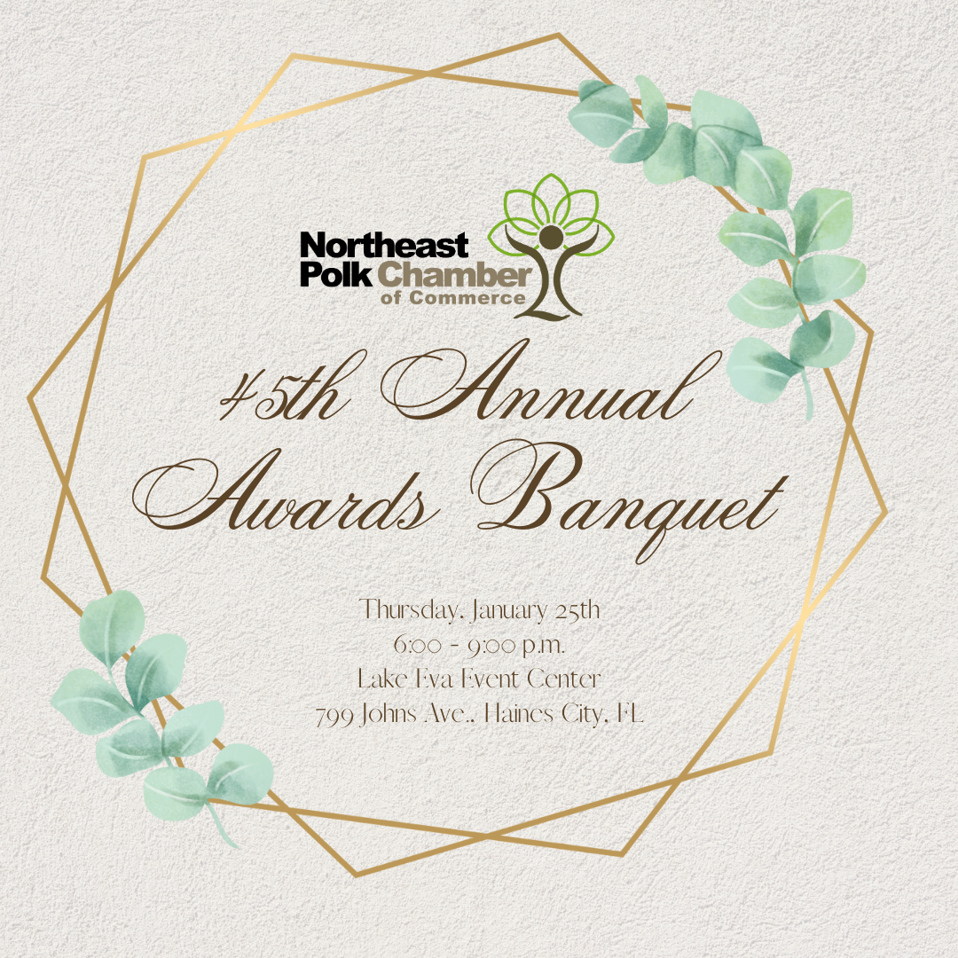 | Save the date & mark your calendars for the Chamber's 45th Annual Awards Banquet! Date: Thursday, January 25th Time: 6 -9 p.m. Location: Lake Eva Event Center, 799 Johns Ave., Haines City, FL 33844 Cost: $45 per person