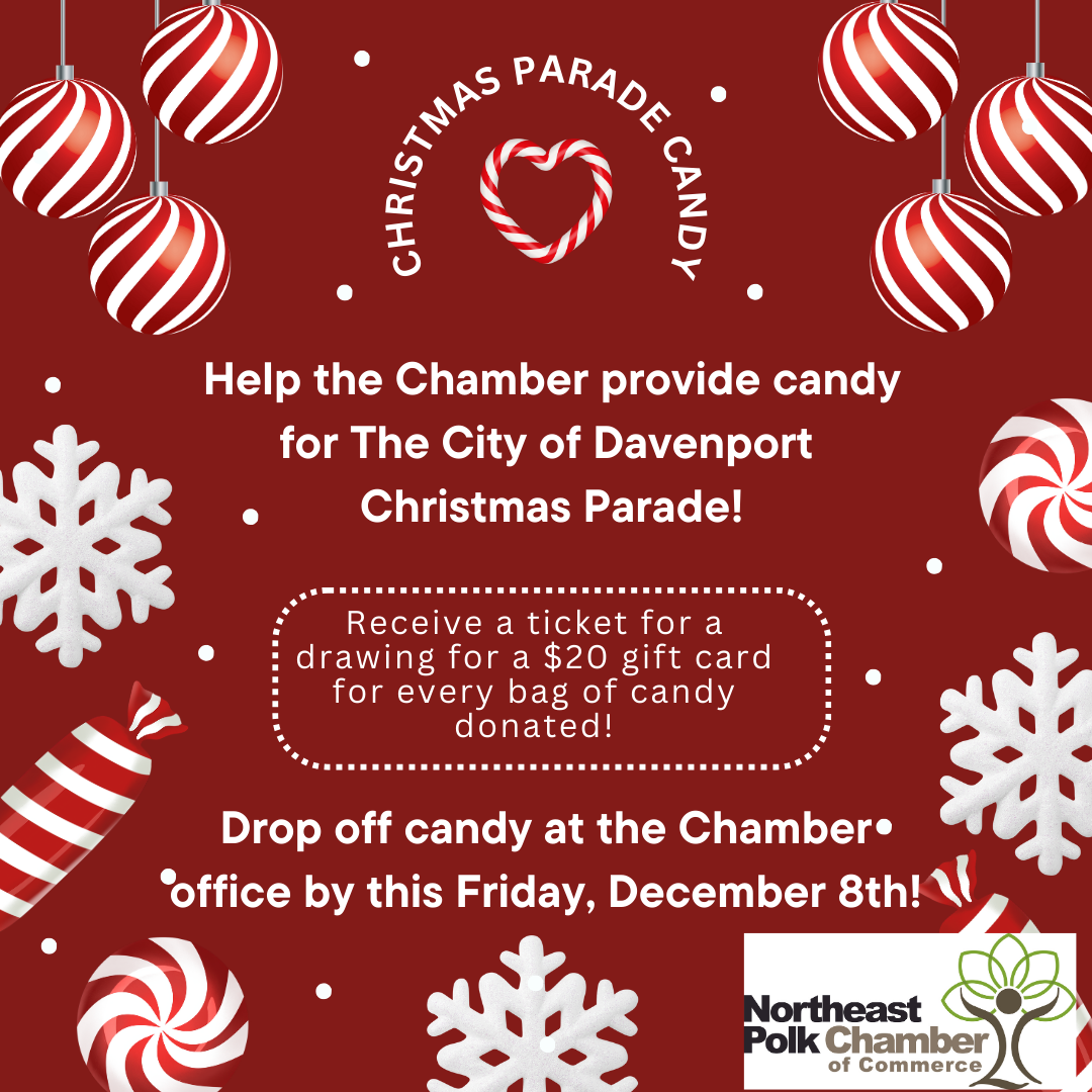 | | Help the Chamber provide candy for the City of Davenport Christmas Parade! Receive a ticket for a drawing for a $20 gift card for every bag of candy donated.