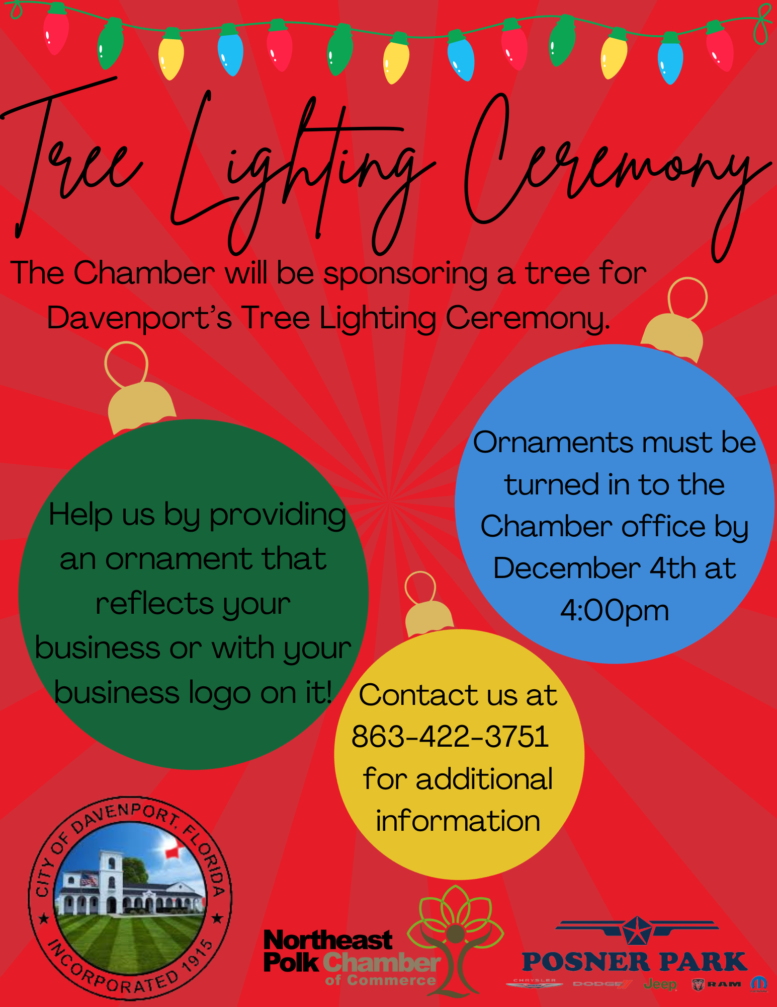 The Chamber will be sponsoring a tree for City of Davenport and Posner Park Chrysler Dodge Jeep Ram FIAT Tree Lighting Ceremony that will be held on Wednesday, December 6th!