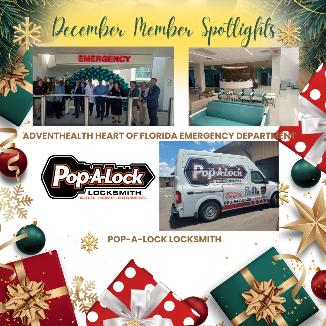 Check out the Chamber's December Member Spotlights: AdventHealth Heart of Florida Emergency Department and Pop-A-Lock of Polk County. Read more about these awesome Members HERE. |