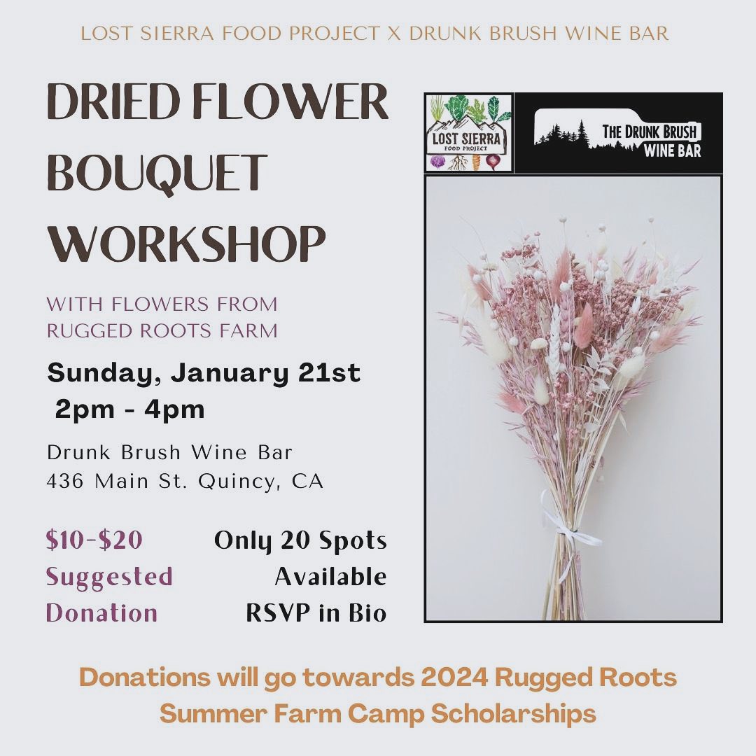 Looking for a way to add color to your space this winter AND help provide scholarships for the Rugged Roots summer camp? Join us in the New Year at the Drunk Brush Wine Bar on Sunday, January 21st from 2-4pm and arrange your very own dried flower bouquet with flowers from Rugged Roots farm. Out of direct sunlight, these elegant bouquets can last up to 3 years.