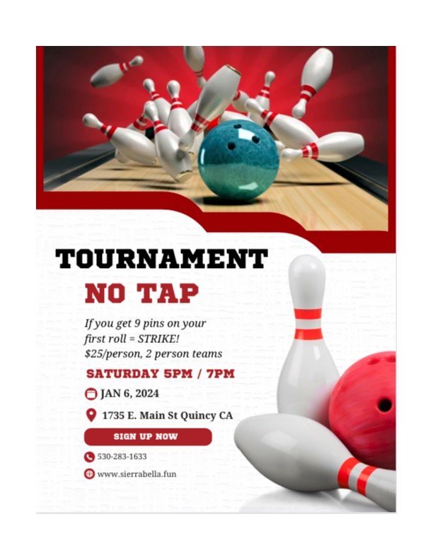 THIS SATURDAY! Get your 2 player team together for our No Tap Tournament. If you get 9 pins on the first ball it counts as.a strike. It will be exciting to see 300 games rolling out of Sierra Bella Lanes. $25 per player 2 Brackets