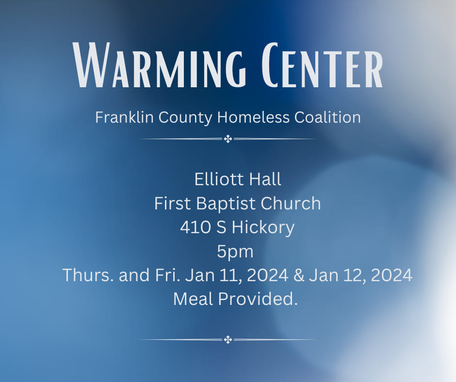 Please be safe as you move around over the next seven days… cold will be getting a whole new meaning. I’m not envious of anyone attending the Chiefs game tomorrow, brrrrr. If you know someone who may be exposed to this for any amount of time and needs a place for sanctuary, share this information about the warming center that will be held at Elliot Hall in the First Baptist Church downtown. Along with a warm place to sit, there will also be hot meals served, extra blankets and gloves, hygiene bags, places to sleep, restrooms, and outlets to recharge your devices. Open for sure through tonight. With cold days in spades following tonight, the United Way of Franklin County is looking for able-bodied individuals to stay the night to keep this offering going longer. If you or someone you know is interested in helping in this way, reach out to Leigh Hansen ASAP so this can be arranged (email Leigh here). Big thanks to the Ottawa Police Department, Ottawa area churches, Franklin County United Way, Homeless Coalition, and the Blessing Box Foundation for getting this organized. There is certainly strength in numbers; our community wouldn’t be the same without your unconditional support of those in need.