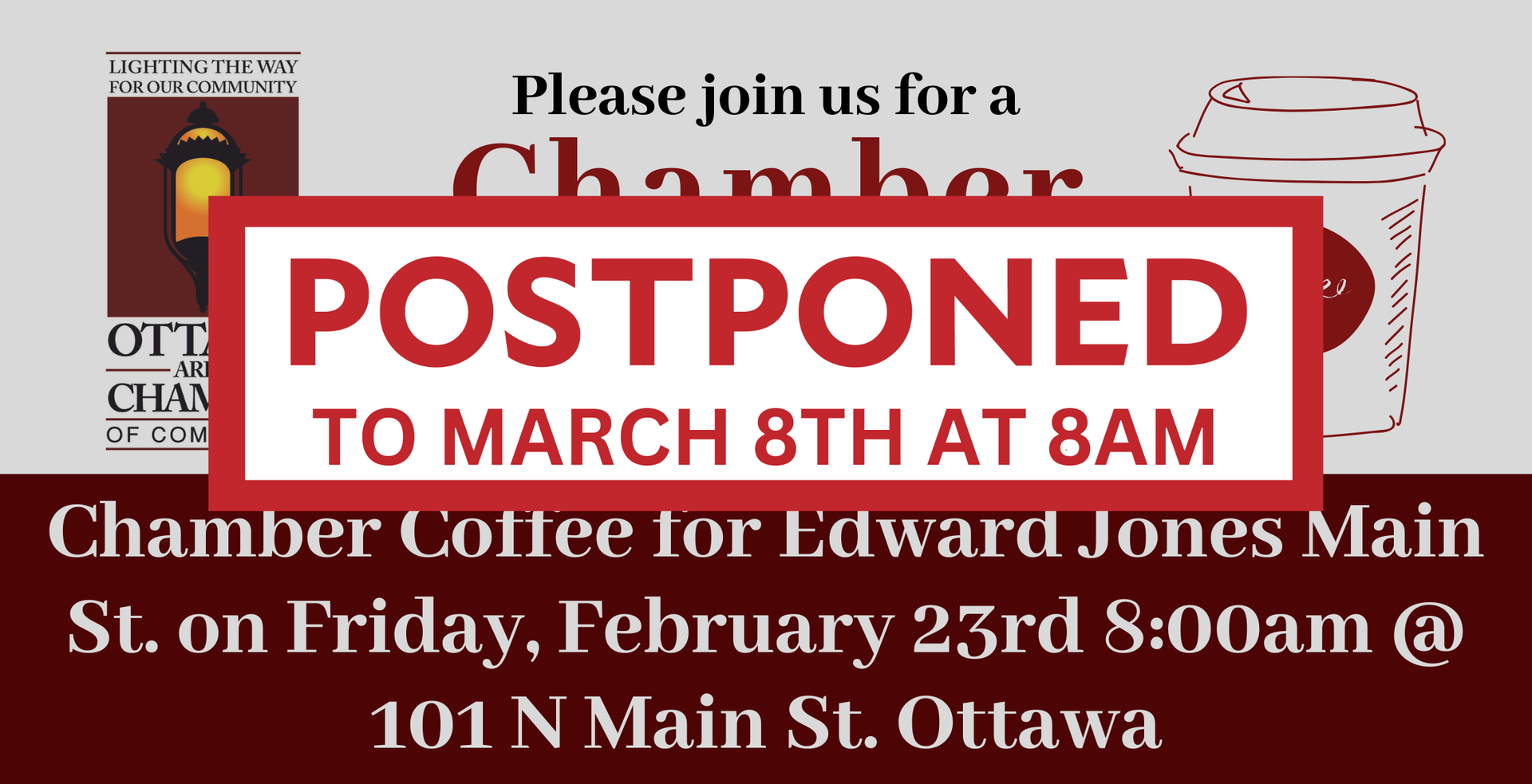 March 1 - 8am, Chamber Ribbon Cutting for the Kansas Children's Service League @ 117 N Main St, Ottawa February 23 March 8 - 8am, Chamber Coffee for Edward Jones Investments (Main St) to introduce New Financial Advisor Casey Lytle @ 101 N Main St, Ottawa March 15 - 8am, Chamber Coffee for ECKAN Head Start @ 225 E 2nd St, Ottawa March 15 - 4:30pm, Chamber Ribbon Cutting for The Lincoln Event Space