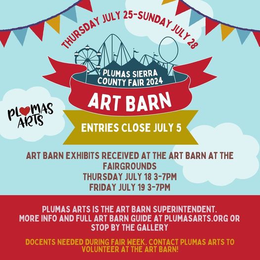 Plumas Arts will also be looking for some fabulous docent volunteers to help receive art and staff the Art Barn during the Fair. Please be in touch if that interests you!