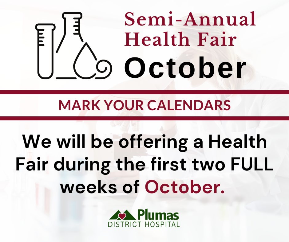 Plumas District Hospital is excited to announce another Health Fair coming your way during the first two full weeks of October!
