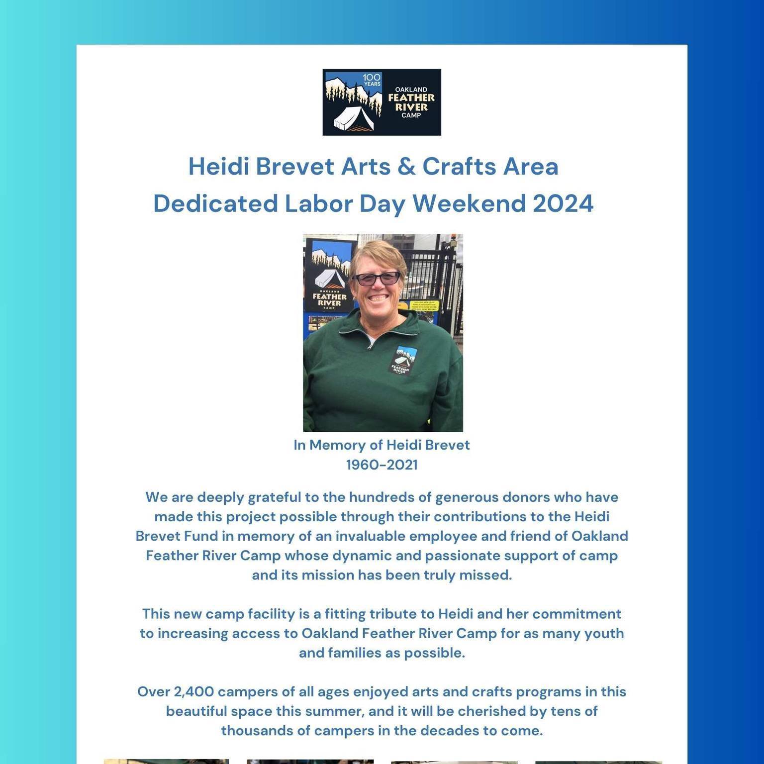 This Labor Day Weekend, Oakland Feather River Camp dedicated the new Heidi Brevet Arts & Crafts Area at Oakland Feather River Camp. They are grateful to Heidi's sister Erica and the hundreds of donors who have joined her in honoring their dearly missed colleague and camper.